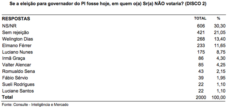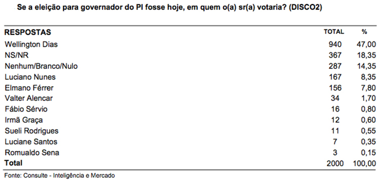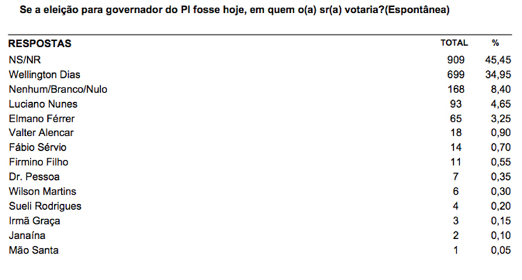 Para governador do Piauí, na espontânea, o governador e pré-candidato a reeleição Wellington Dias (PT) aparece com 34,95% das intenções de votos. Na estimulada para o Governo do Estado, W.Dias aparece na frente com 47% das intenções de votos. Em segundo lugar aparece o deputado estadual Luciano Nunes (PSDB) com 8,35% das intenções de votos, em terceiro lugar o senador licenciado Elmano Ferrer (Podemos) com 7,80%, em quarto lugar o advogado Valter Alencar (PSC) com 1,70% e em quinto lugar o jornalista e empresário Fábio Sérvio (PSL) com 0,80%. Na rejeição, W.Dias aparece com 13,40%, seguido por Elmano com 11,65%, Luciano Nunes com 8,75%, Irmã Graça (Rede) com 4,30% e Valter Alencar com 4,25%.