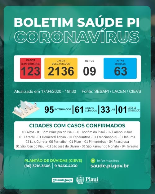 Em boletim epidemiológico divulgado na noite desta sexta-feira, 17, a Secretaria de Estado da Saúde do Piauí informou que já são 63, o número de curados do coronavírus em todo território piauiense.