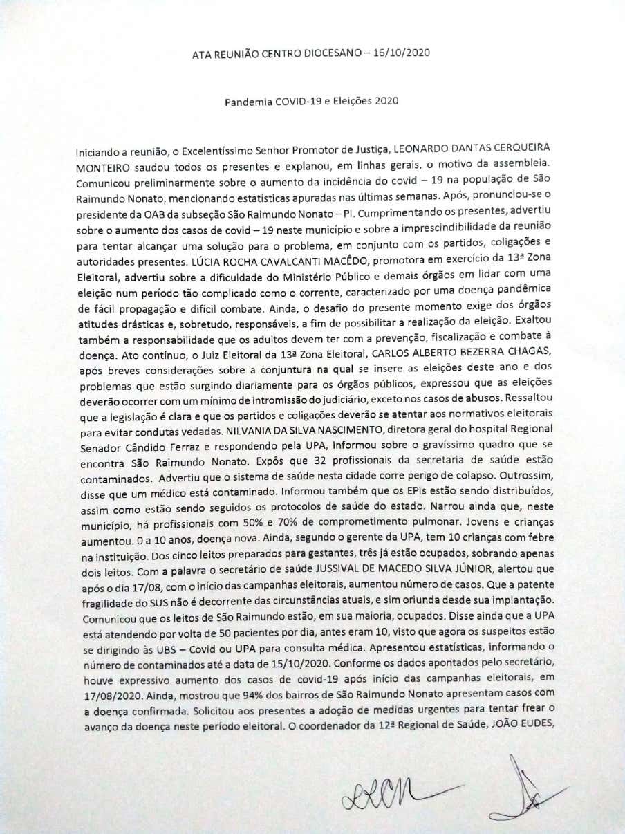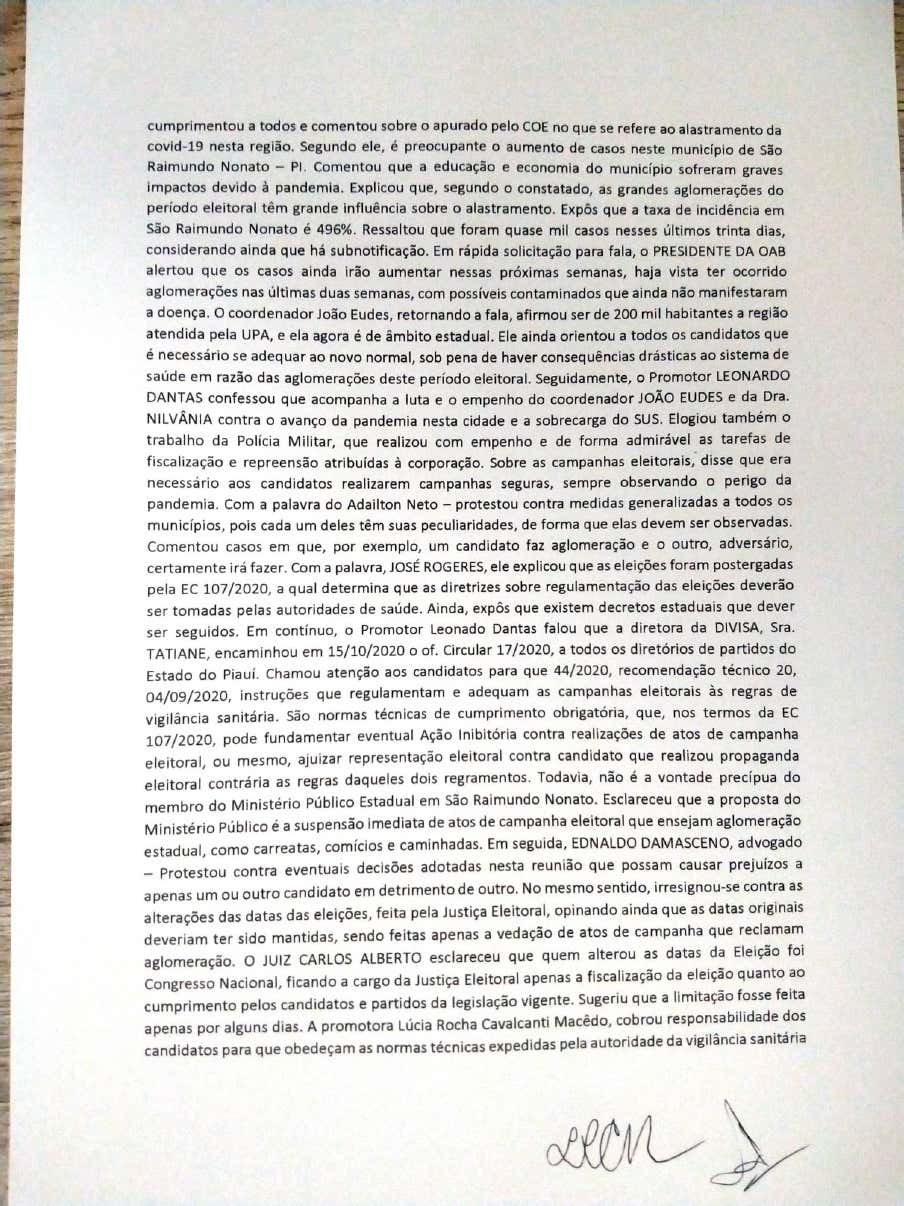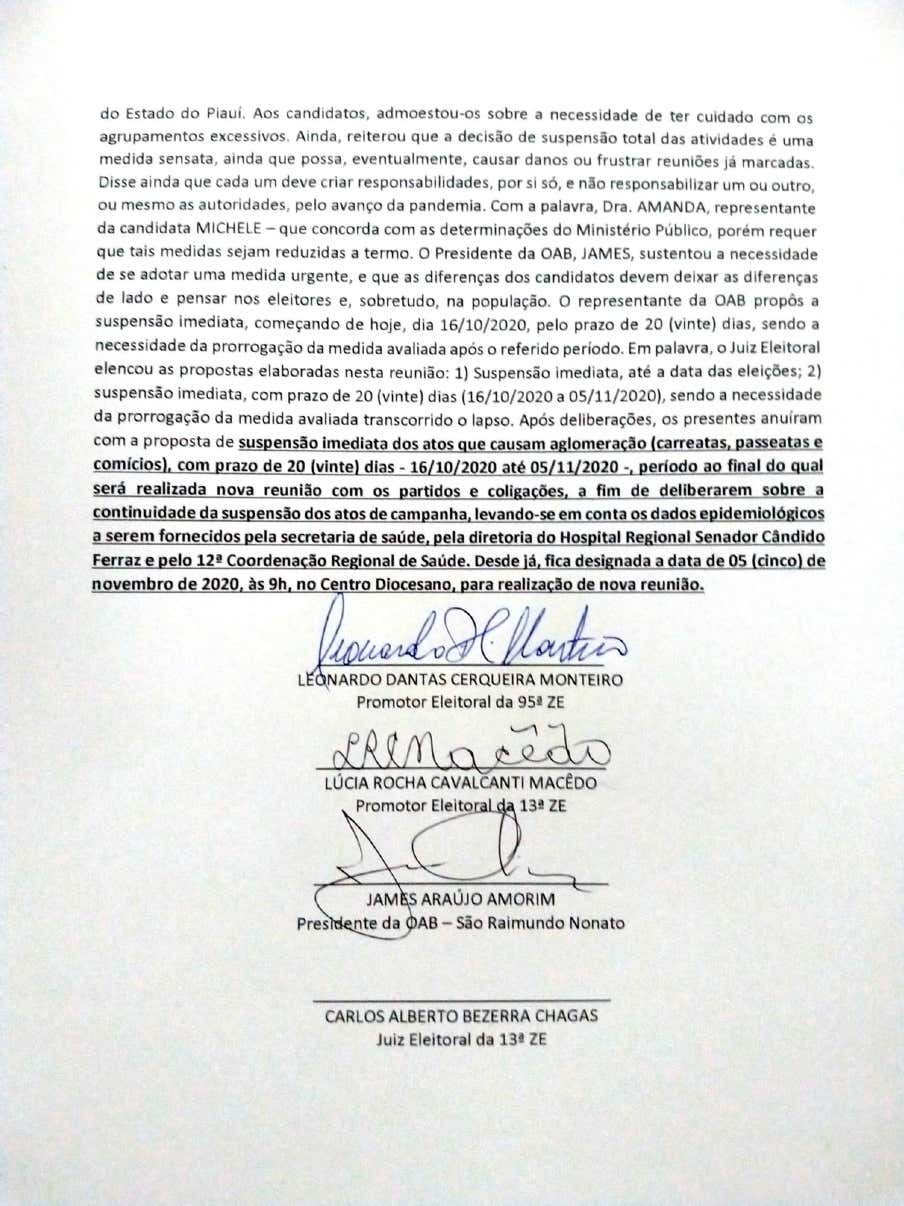 Na última sexta-feira, 16, em uma reunião com todos os candidatos das 13ª e 95ª Zonas Eleitorais, o Ministério Público Eleitoral, membros da Ordem dos Advogados do Brasil, Polícia Militar e autoridades de saúde, ficou decidido a suspensão de carreatas, comícios e passeatas em nove municípios que compõem as respectivas zonas eleitorais do Território Serra da Capivara.