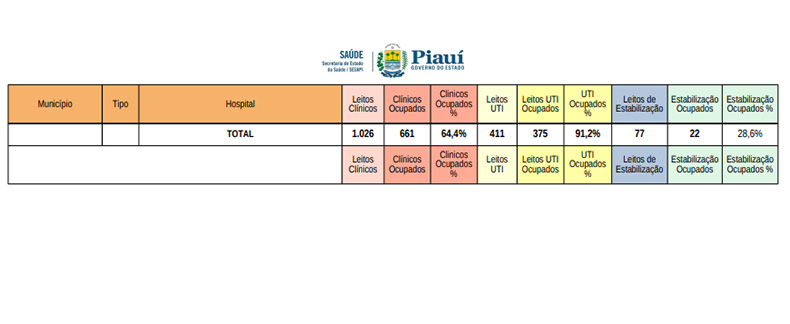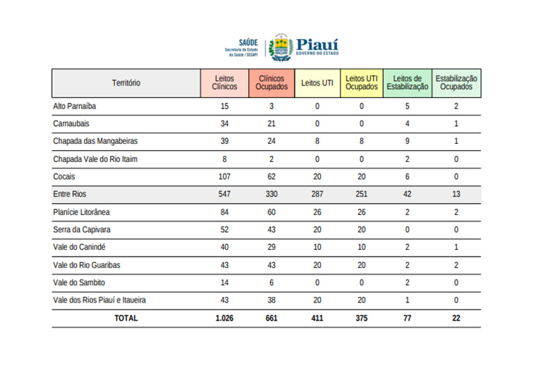 Os territórios com 100% de leitos de UTI ocupados são:  Cocais, Planície Litorânea, Vale do Rio Guaribas, Vale do Canindé, Vales dos Rios Piauí e Itaueiras, Serra da Capivara e Chapada das Mangabeiras.