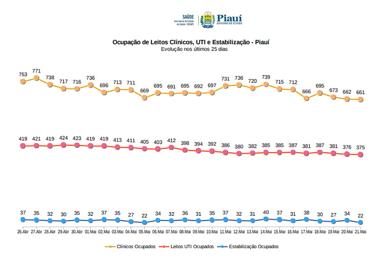 Confira o gráfico de ocupação dos leitos clínicos, de UTI e de estabilização nos últimos dias.