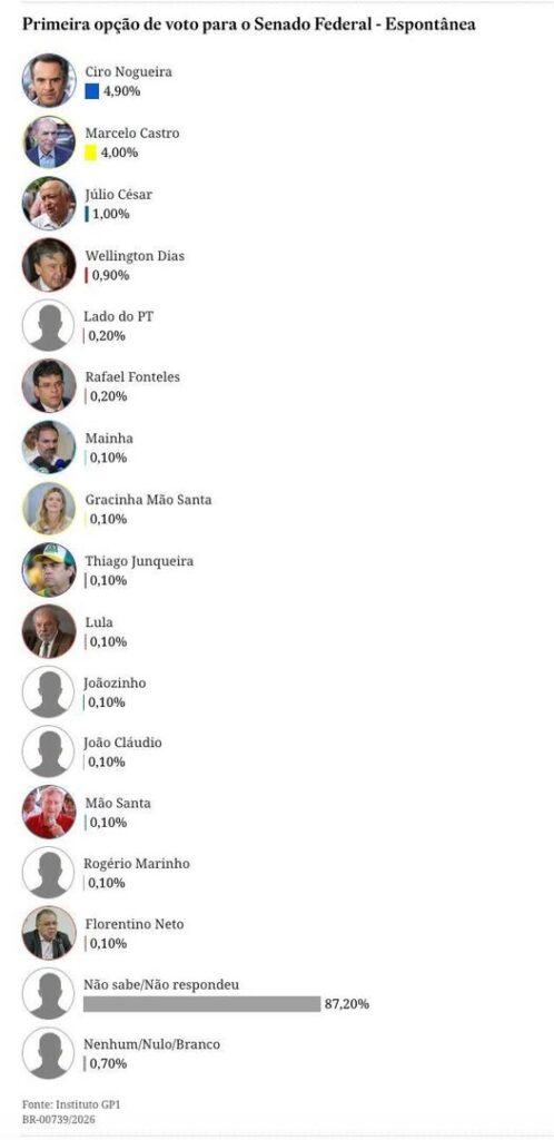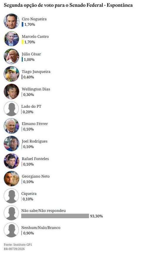 O senador Ciro Nogueira (Progressistas) se consolida como pré-candidato a reeleição e lidera em todos os cenários na mais nova pesquisa do Instituto GP1, divulgada nesta segunda-feira.
