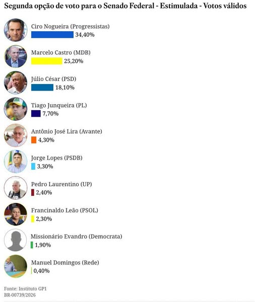 Segundo o cenário de pesquisa estimulada, Ciro lidera com 31,70% das intenções de votos. Bem mais atrás estão os pré-candidatos Marcelo Castro, do MDB, com 15%, e Júlio César (PSD) com 10,20%.